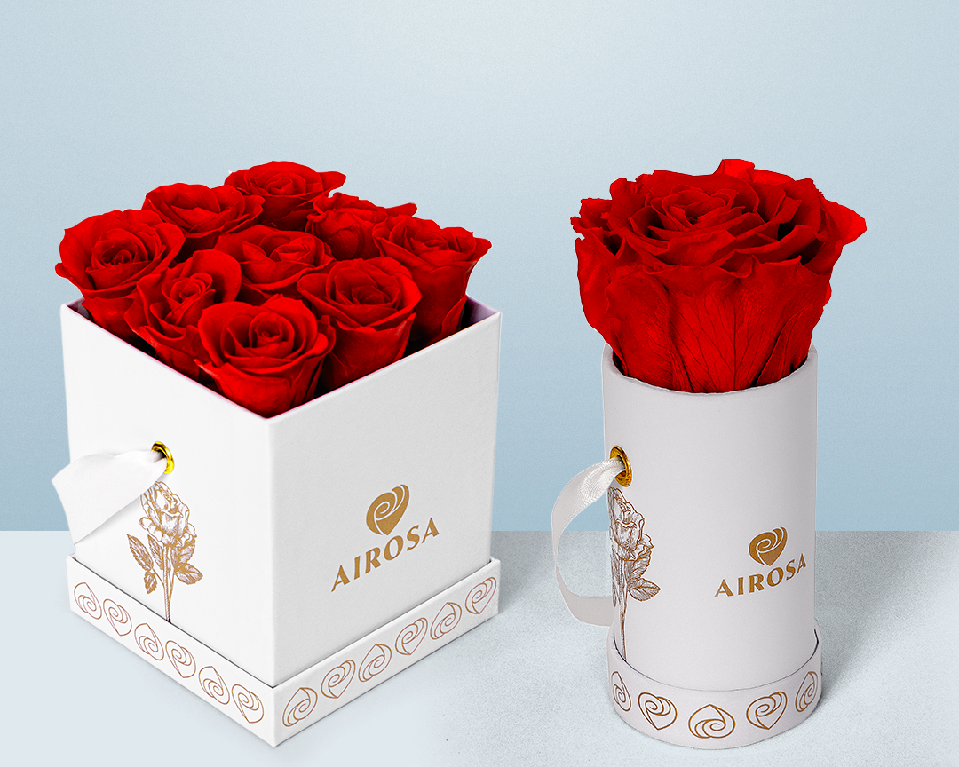 Pack 01 Rosa preservada Airosa. Nuestro Box Premium se componen de UNA & NUEVE mini hermosas rosas Natural que Dura un Año. Este detalle elevará cualquier espacio con gracia y majestuosidad.