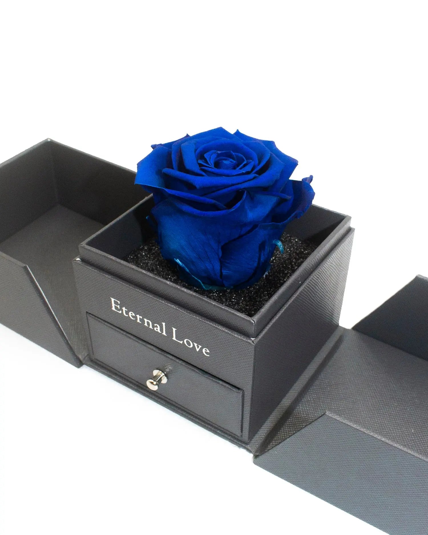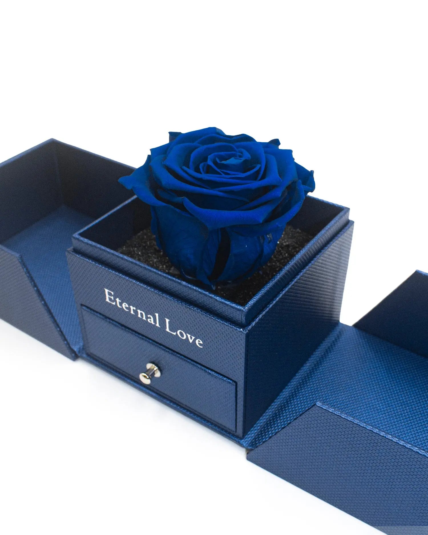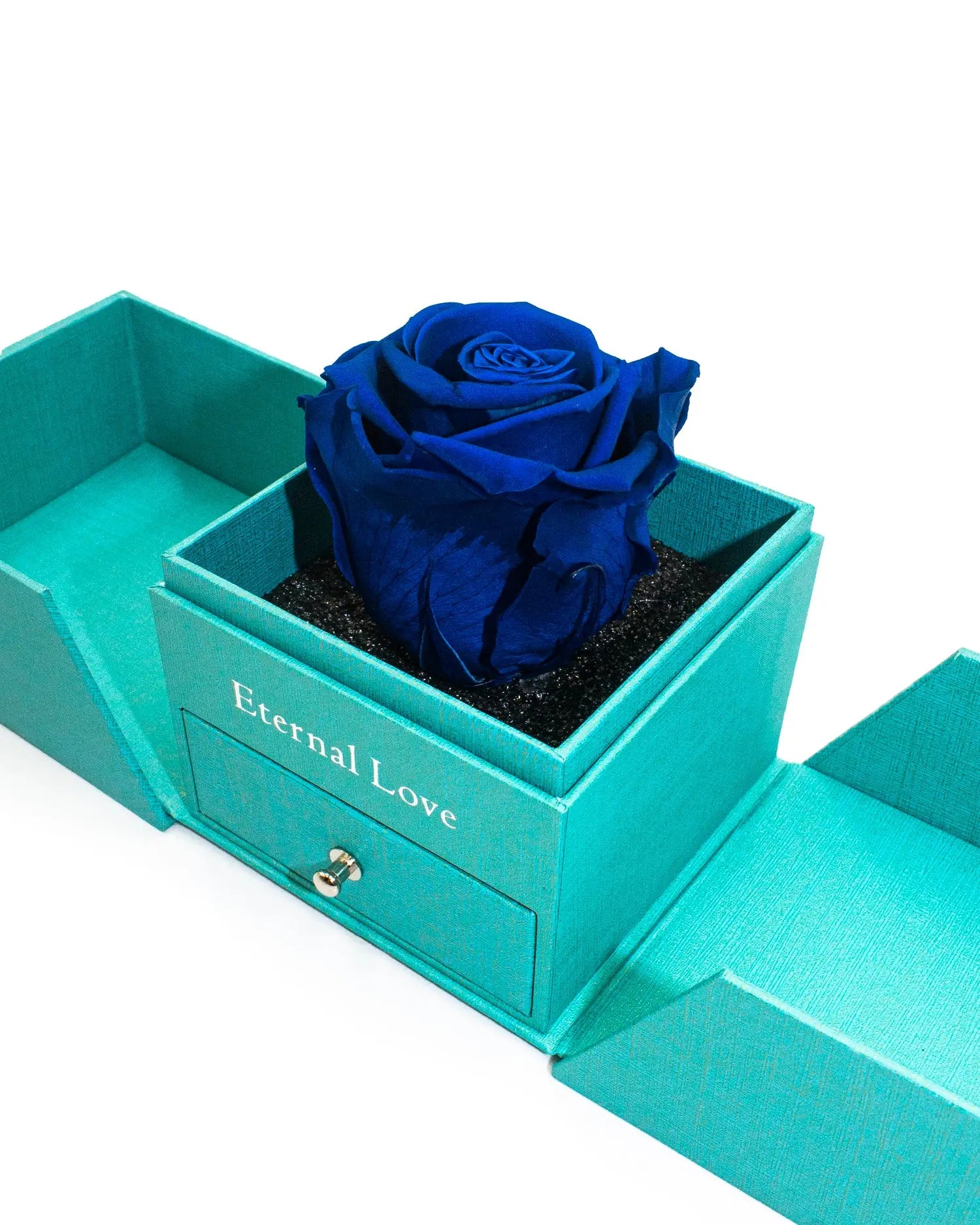 Rosa Eterna Large Azul Airosa preservada Mística. Nuestro lujoso joyero Premium se componen de una hermosa rosa Natural que Dura un Año, colocadas en joyero inspirados en la elegancia. Este detalle elevará cualquier espacio con gracia y majestuosidad.