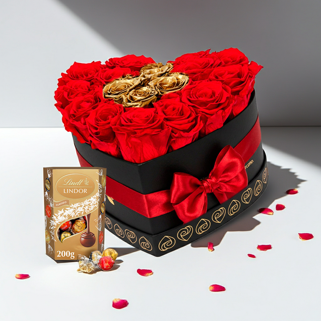 Amor Eterno Dorado: rosas preservadas con chocolate Lindt